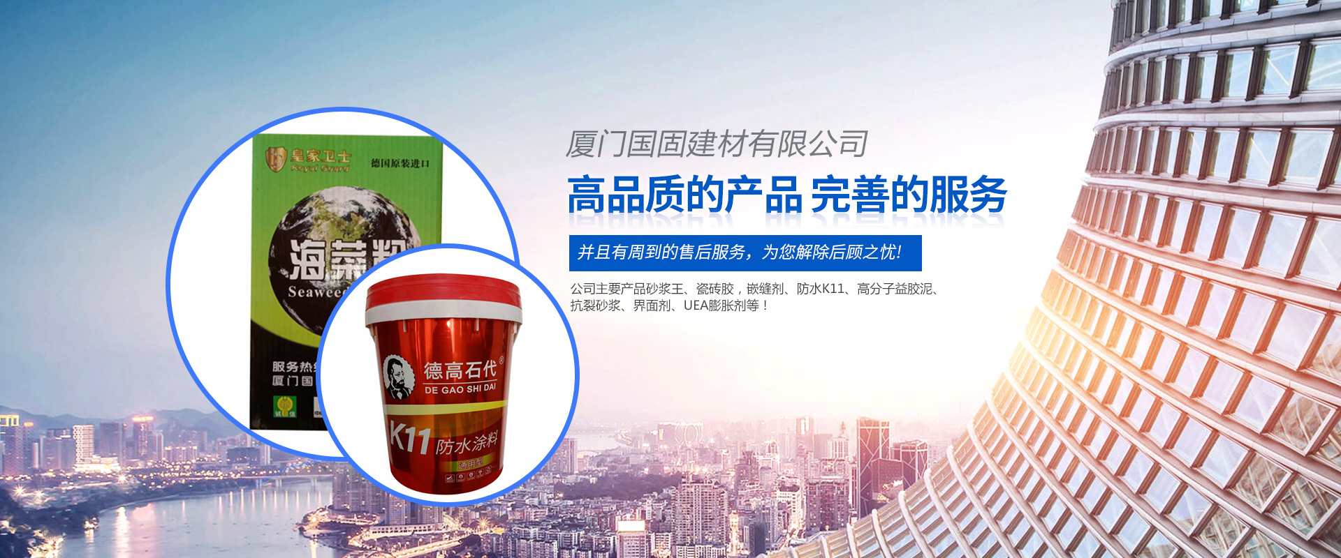 ??廈門國固建材有限公司是集科研開發(fā),生產(chǎn)為一體的混凝土外加劑科技生產(chǎn)單位,公司技術(shù)力量雄厚,工藝科學(xué)先進(jìn),產(chǎn)品質(zhì)量及性能在全國同行業(yè)中。并且有周到的售后服務(wù),為您解除后顧之憂。本廠生產(chǎn)的產(chǎn)品,科技含量高,質(zhì)量穩(wěn)定,檢驗嚴(yán)格,其主要技術(shù)指標(biāo)經(jīng)福建建筑科學(xué)院嚴(yán)格鑒定測試后均達(dá)到國標(biāo)標(biāo)準(zhǔn)。是目前水泥制品中理想的名加劑產(chǎn)品,適用道路、橋梁、工業(yè)與民用建筑,對鋼筋無繡蝕、具有良好的經(jīng)濟及環(huán)保效益,是國家建筑學(xué)會積極推廣的外加劑產(chǎn)品。本廠推廣標(biāo)準(zhǔn)化,規(guī)范化、程序化管理、具有健全、完善、持續(xù)穩(wěn)定運行的質(zhì)量保證體系。產(chǎn)品遠(yuǎn)銷上海、江蘇、浙江、廣州、北京、江西、安徽、福建等地,在大批國家建設(shè)工程中應(yīng)用效果良好,并以性能優(yōu)越、質(zhì)量可靠、以及良好的售后服務(wù)在市場上享有很高的信譽。本廠在今后的歷程中,將一如既往的為您提供高質(zhì)量、高科技的產(chǎn)品,完善的服務(wù)以感謝廣大客戶的支持和厚愛。“科技創(chuàng)新、以誠為本,用戶滿意”是我公司發(fā)展的永恒目標(biāo),我們堅持“以誠結(jié)情、質(zhì)量取勝”,以高品質(zhì)的產(chǎn)品回報社會。“用科興建材,創(chuàng)優(yōu)品工程”,期待與各界朋友與時俱進(jìn),努力開拓進(jìn)取,力求為用戶提供“高品質(zhì)的產(chǎn)品,完善的服務(wù)”。公司愿與設(shè)計部門、建設(shè)單位、施工企業(yè)及同行們攜手合作,共創(chuàng)未來,共鑄輝煌、公司主要產(chǎn)品砂漿王、瓷磚膠,嵌縫劑、防水K11、高分子益膠泥、抗裂砂漿、界面劑、UEA膨脹劑等!